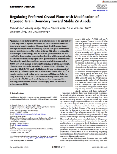近日,学校先进碳基功能材料湖南省重点实验室侯朝辉教授、中国成人免费毛片周苗博士在开发高性能水系锌离子电池关键负极材料中取得新进展,研究成果以“Regulating Preferred Crystal Plane with Modification of Exposed Grain Boundary Toward Stable Zn Anode”为题发表于Advanced Functional Materials杂志(IF18.5,SCI一区TOP期刊,材料科学类JCR排名第一)。我校为该论文的第一完成单位,周苗博士为第一作者和通讯作者,侯朝辉教授和中南大学方国赵教授为共同通讯作者。