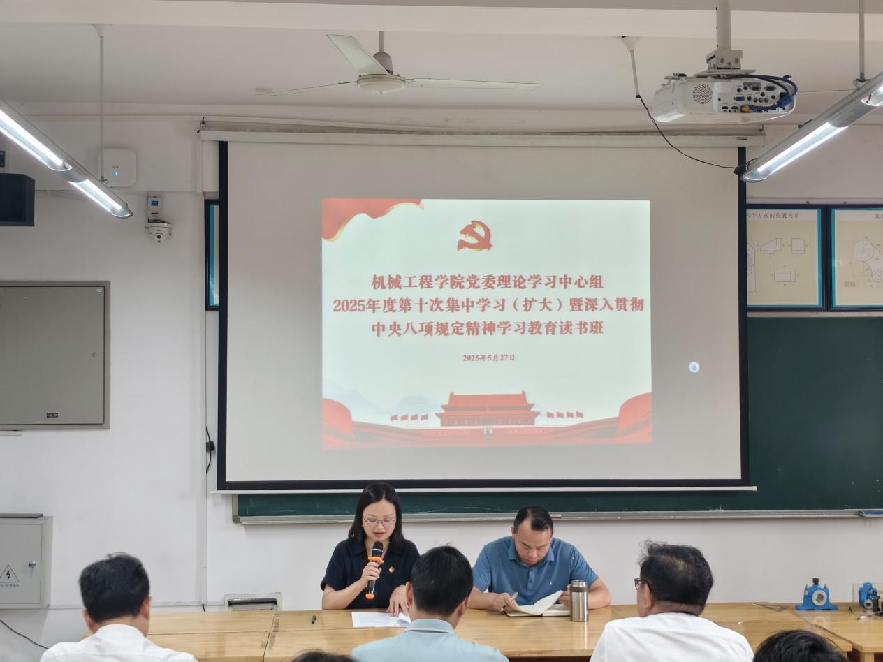 5月27日14:30,机械学院党委理论学习中心组在16310教室举行2025年度第十次集中学习(扩大)暨深入贯彻中央八项规定精神学习教育读书班,学院党委班子成员、全体教师党员参加,会议由党委书记徐丹主持。