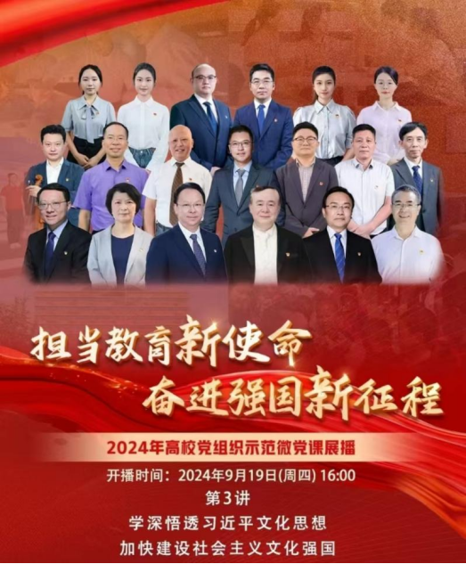为深入学习贯彻党的二十大精神,学深悟透习近平文化思想,实干笃行展现高校文化担当,9月19日16:00,我院党委于16325会议室组织师生党员集中观看学习2024年高校党组织示范微党课第三讲《学深悟透习近平文化思想,加快建设社会主义文化强国》。