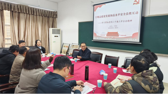 为深入学习贯彻党的二十届三中全会精神,持续推进“七进两联系”工作落实情况,12月25日下午,我院在16310B会议室开展以“实现高质量发展和高水平安全良性互动”为主题的党课。校党委委员、副校长丁跃浇主讲,院党委书记徐丹主持,副院长周勇(主持工作)、副院长谭晶莹、副院长张敬、副书记李凯以及学院师生党员代表参加。