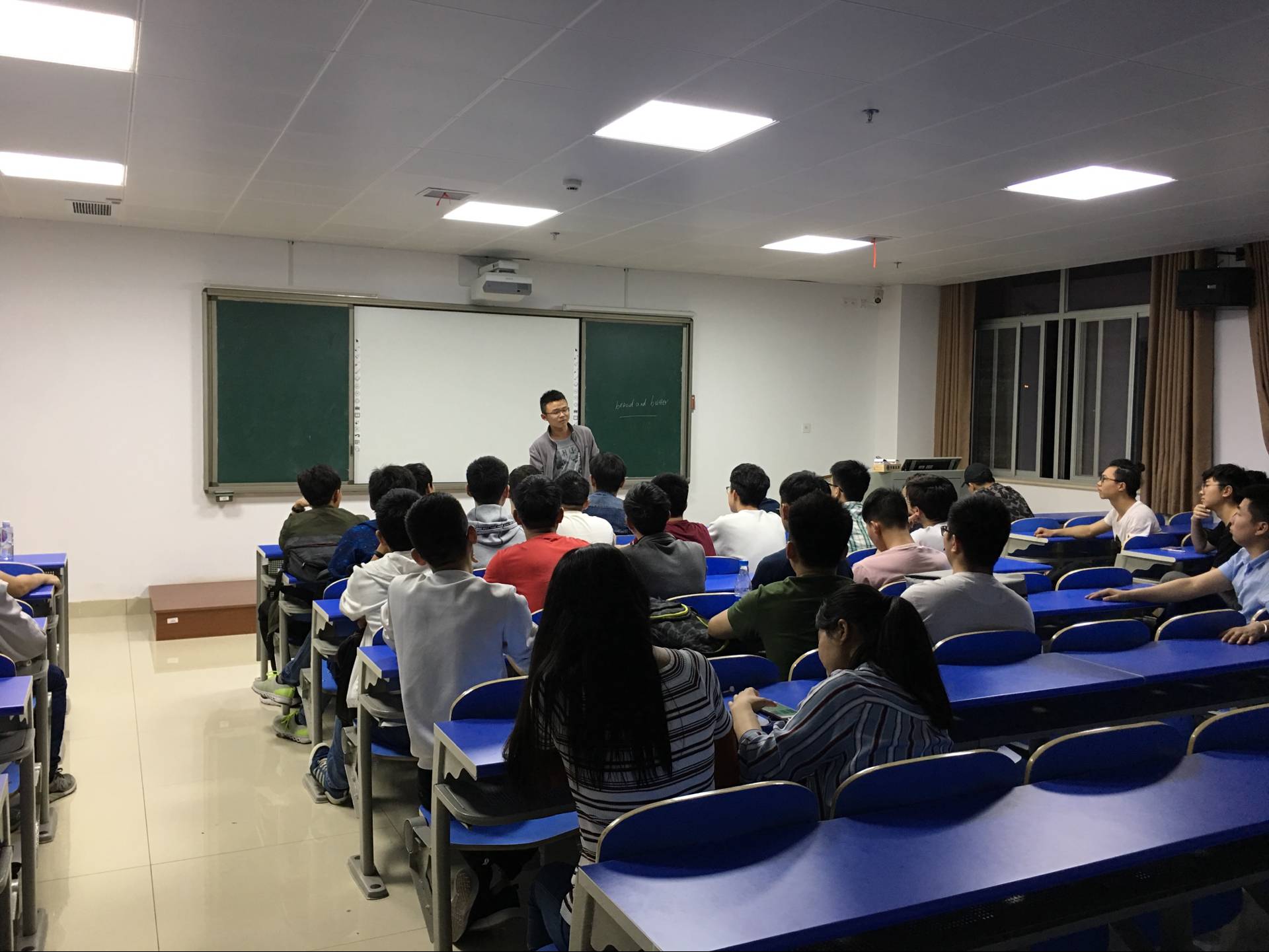 杨海学长从怎样选择考研学校以及如何复习两个大方面入手,详细地分享了他的考研经验。他提醒同学们在选择学校之时要根据自身实力,从专业排名、综合实力和地理位置入手,分别选择略高于自身实力、与实力对等和略低于自身实力的三个学校。并让同学们不仅仅要关注分数线,更要了解意向学校的报录比以及确定自己对于学硕和专硕的选择。在说到如何复习时,他重点提及了数学和英语的复习。他认为:数学要分阶段复习,在“刷真题”阶段要重视查漏补缺,整合各个题型对应的考点,随后,他分析了现在市面上著名的几大老师教学方法的区别及其优劣;英语也应该多做真题,在进行单词的记忆的同时,可以自行归纳核心。杨海学长分享结束之际,语重心长地送给了同学们一句话:考研并非易事,也不是唯一的路,不要盲目跟风。